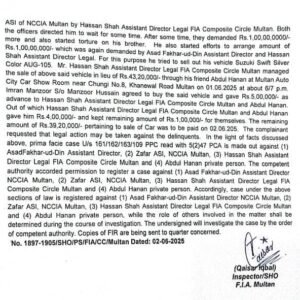 A serious case of corruption and abuse of power has come to light in Multan. According to a First Information Report (FIR) filed on June 1, 2025, Muhammad Rafiq, a resident of Okara, reported that on the night of May 31, 2025, his brother Muhammad Shafiq was apprehended by Asad Fakhar-ud-Din, Assistant Director of the National Cyber Crime Investigation Agency (NCCIA) Multan, from KFC Bypass Okara and was taken to Multan.