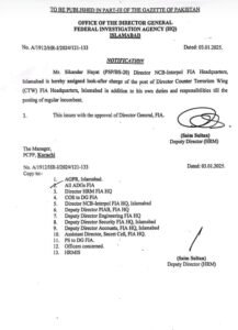 In the case of Sania Shahid Director General FIA removed Humayun Masood Sandhu, the Deputy Inspector General and the head of the Counter Terrorism Wing (CTW) of the Federal Investigation Agency from the office, and the Additional Charge of the Director of Counter Terrorism Wing (CTW) has been allotted to Director Interpol Sikandar Hayat Khan.