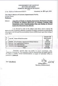 According to an official communication dated April 13, 2025, addressed to the Chief Collector of Customs (Appraisement-North), Peshawar, the approval has been granted by the competent authority. The reward allocations were determined using the Reward Recommendation System (RSS), which assesses the final performance rating of each officer.