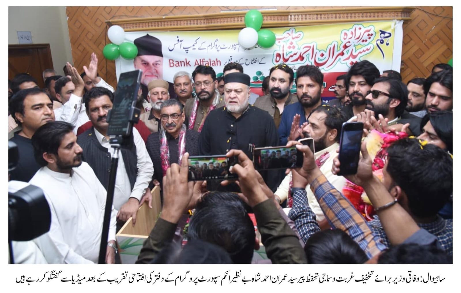 Sahiwal – Federal Minister for Poverty Alleviation and Social Safety, Syed Imran Ahmad Shah, inaugurated the Benazir Income Support Programme (BISP) Camp Office in Sahiwal today. Following the inauguration, the Minister addressed the media and highlighted the government’s comprehensive efforts to reduce poverty and improve social welfare across the country.