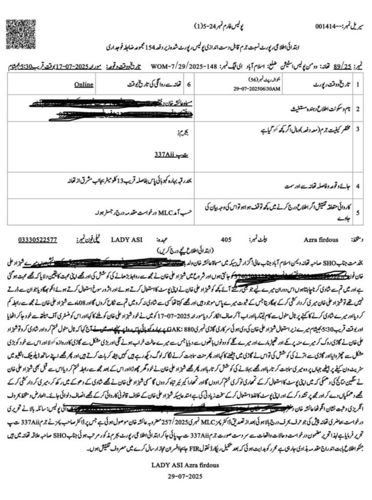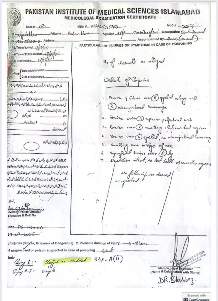 The young officer has accused Dr. Shahzad Ali Khan of exploiting her trust over the past three years by professing love, promising marriage, and repeatedly pressing her to enter into a secret marriage with him despite already being married with grown children. According to her, the Vice Chancellor insisted that an open marriage would have negative consequences for his married daughter, and therefore urged her to agree to a secret union. When she refused, she alleged that he not only prevented her from marrying elsewhere but also subjected her to psychological and physical pressure. Matters escalated, she claims, when she again refused his demands, leading to an incident in which she was physically assaulted inside the car of the Vice Chancellor, causing injuries later confirmed in a PIMS medical report submitted to the Women’s Police Station.