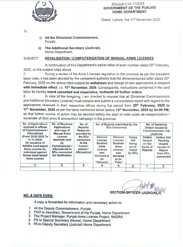 The Home Department has also sought comprehensive reports from commissioners and deputy commissioners across Punjab regarding the ongoing de-weaponization campaign and the collection of illegal firearms. District administrations have been instructed to submit data by the evening of November 13, covering all applications and notifications issued from March to November.