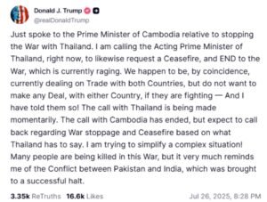 President Trump said, “The phone call with Thailand is being made in a few moments, the talks with Cambodia have been completed, but as soon as the position from Thailand comes out, we will contact them again to discuss a ceasefire and stop the fighting.”