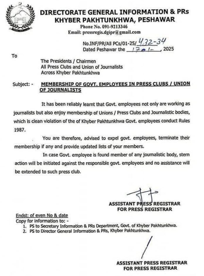 As per the notification of the Directorate General Information and PRs ( Khyber Pakhtunkhwa ) Peshawar, all the presidents, Chairmen OF the Union of Journalists, and press clubs across the province are requested to expel govt employees, terminate their membership. As many of the government employees not only work as journalists but also enjoy membership of unions/ press clubs and journalists’ bodies. Which is a clear violation of the Khyber Pakhtunkhwa Govt, Employees Conduct Rules 1987.